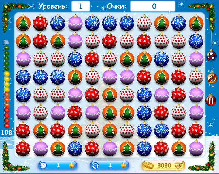Ваша задача — собрать все ёлочные игрушки с игрового поля! Убирать игрушки нужно парами, путь между ними должен быть свободным и не превышать двух углов (поворотов).